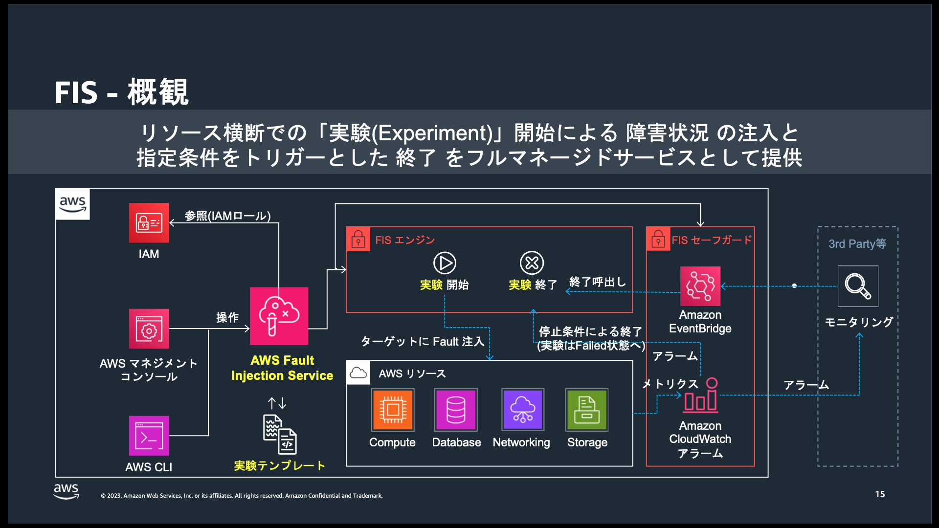 - AWS Fault Injection Service は障害シナリオを実行できるサービスです。re:Invent 2023 では新たに AZ 障害とリージョン間接続の切断を想定した障害の追加が発表されました。アプリケーションを運用する際に可用性向上のため、マルチ AZ 構成や DR 構成を利用する場合もあるかと思います。用意した構成が障害発生時に正しく動作するのかを AWS Fault Injection Service を使って検証し、デモをお届けします。