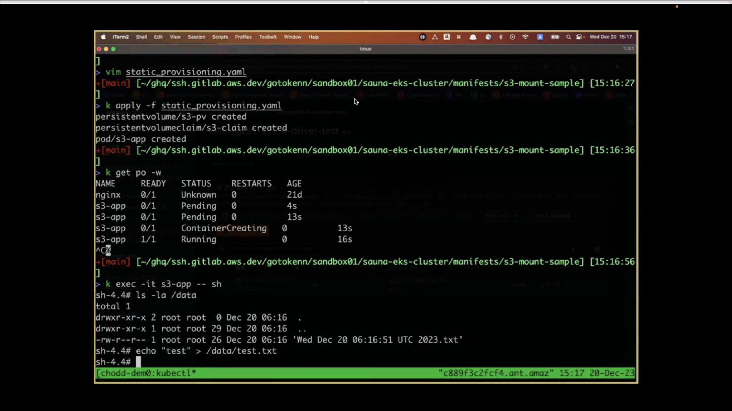 3 つ目のセッションでは、ソリューションアーキテクトの後藤から、Amazon EKS に関するアップデートを 2 つご紹介しました。 EKS Pod Identity は、各 Pod の権限設定を AWS の API のみで完結させることができる機能です。これまでも IAM Roles for Service Accounts (IRSA) で同様の設定ができましたが、Kubernetes と AWS リソースの両方を修正する必要がありました。EKS Pod Identity によって、AWS の API のみで Kubernetes Service Account への IAM ロールの紐付けが完結するので、よりシンプルに Pod の権限を設定できます。また、2 つ目にご紹介した Mountpoint for Amazon S3 CSI driver によって、Kubernetes の Pod が Amazon S3 のオブジェクトに対してファイルシステムのインターフェースを使用してアクセスできます。デモでは、EKS Pod Identity を使用して IAM Role を Kubernetes Service Account に紐づける様子、Mountpoint for Amazon S3 CSI driver を使用して Kubernetes の Pod から S3 のオブジェクトにアクセスできる様子をお見せしました。EKS をご利用のお客様にご覧いただきたい内容となっています!