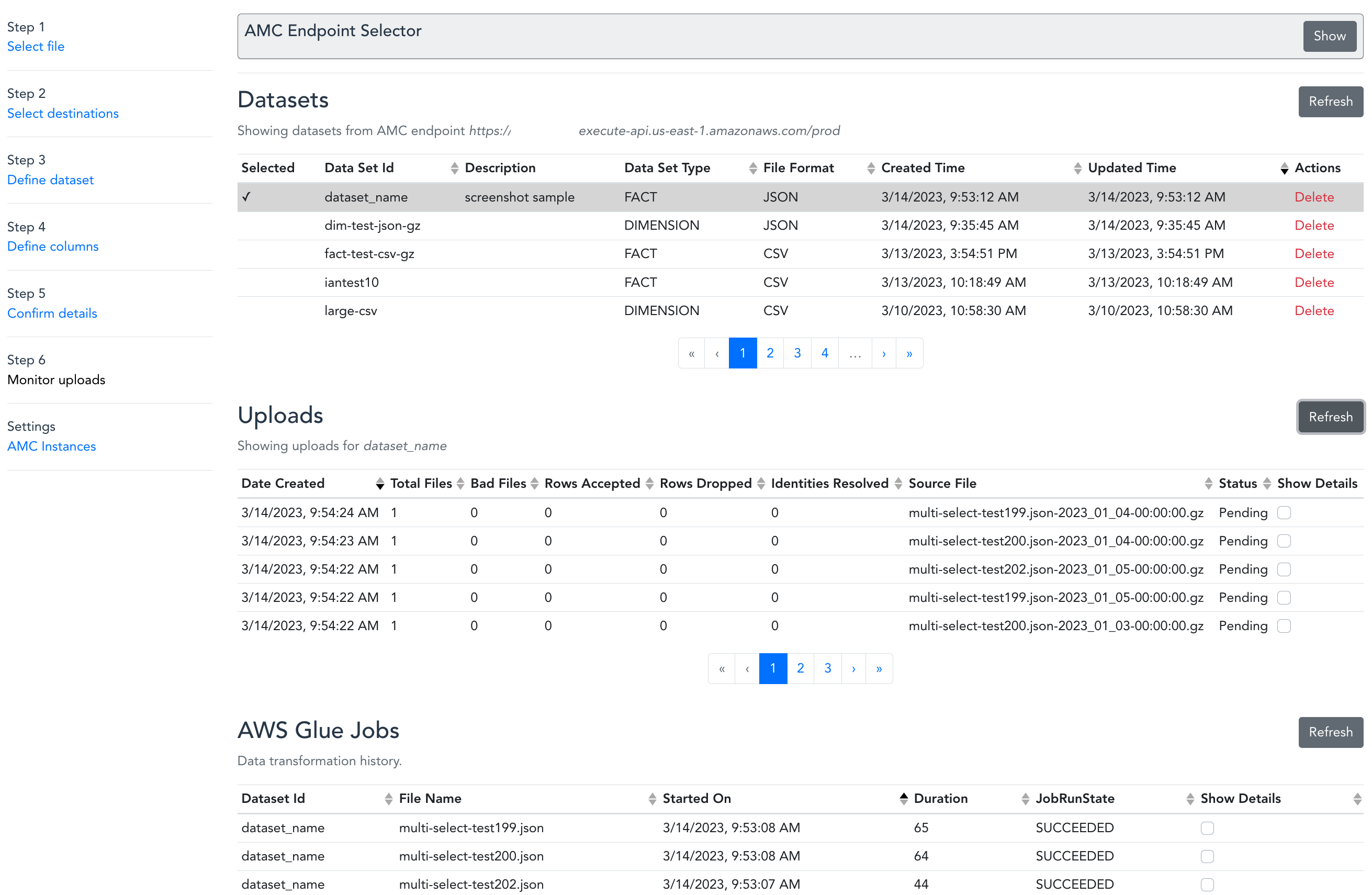 このページでは、データセットの作成、アップロード状況、AWS Glue による前処理ジョブの実行状況をモニタリングすることができます。各ステップが非同期に実行されるため、データセットの登録後、短時間で AMC へのアップロード完了が確認できることもあれば、少し時間を要することもあります。アップロードするデータサイズによっても処理時間は変動します。