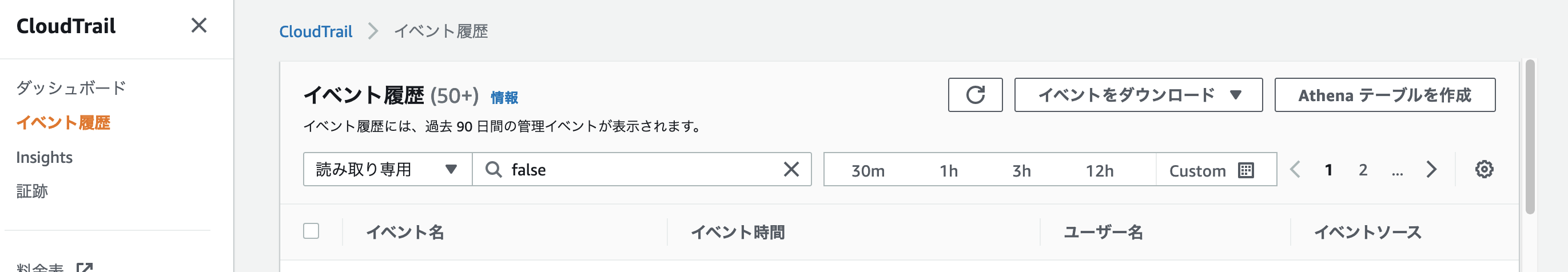 図 1: CloudTrail コンソールのイベント履歴ページ