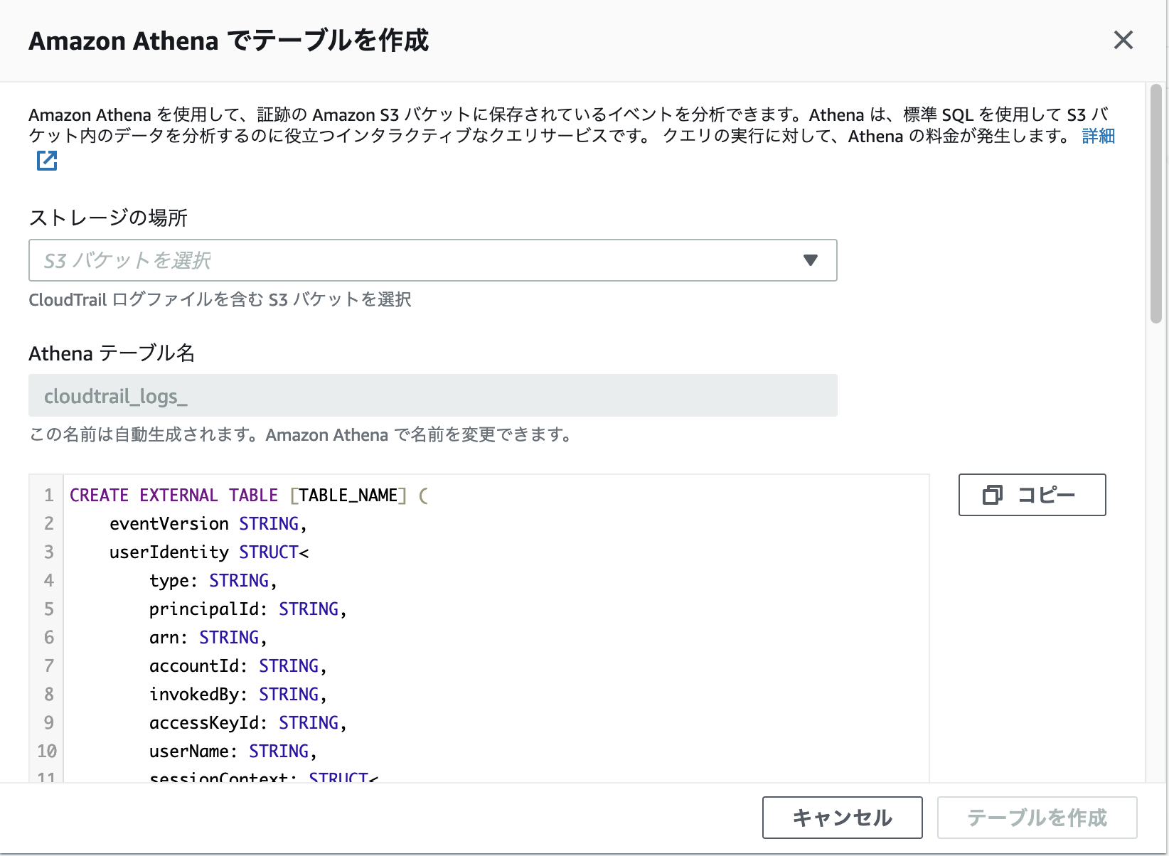 [テーブルを作成]を選択してテーブルを作成します。クエリを編集する必要がある場合は、このステートメントをコピーして Athena コンソールで編集したクエリを実行してください。CREATE TABLE ステートメント中の [TABLE_NAME] (1行目) , [S3_BUCKET_NAME](46行目), [S3_BUCKET_URL] (50行目)が置き換えられ、次のようになります。