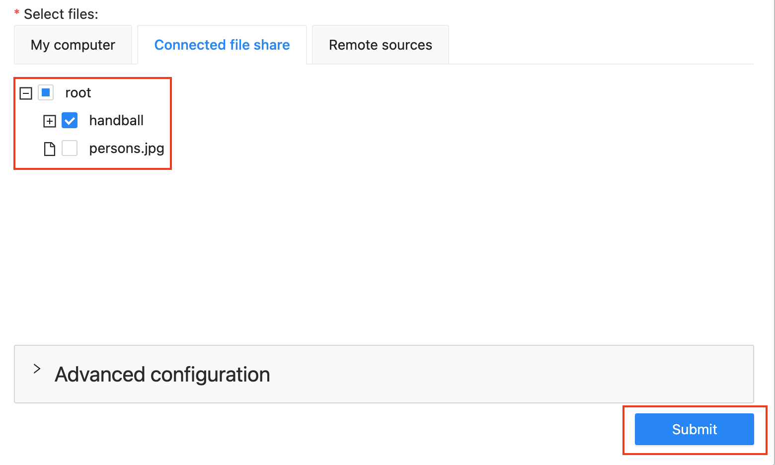 Connected file share の裏側は Amazon EFS であり、デモ用のデータが保存されています。root<<<handballを選択してください。このフォルダにはある動画の 400 枚のフレーム画像が入っています。Submit ボタンをクリックします。