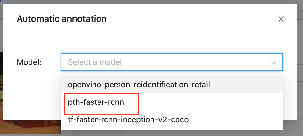 Automatic annotation をクリックしますと,どのモデルを使用するかの画面が出てきます。今回は pth-faster-rcnn を選択します。