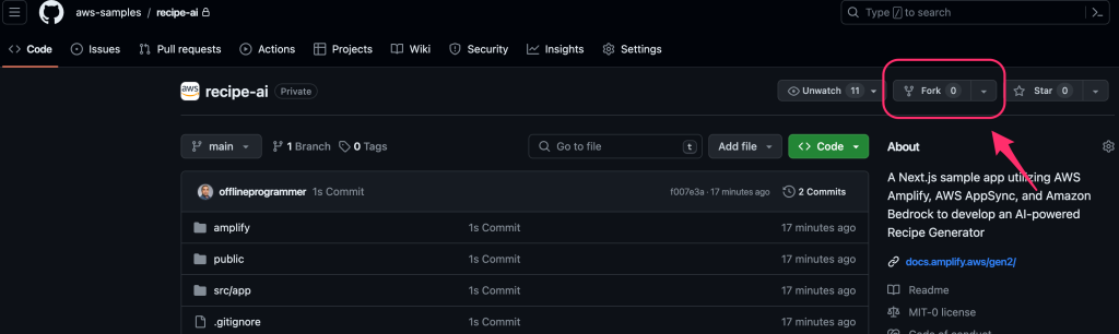 ステップ 1: AWS Samples のリポジトリに移動し、Fork ボタンから自分のリポジトリに Fork します
