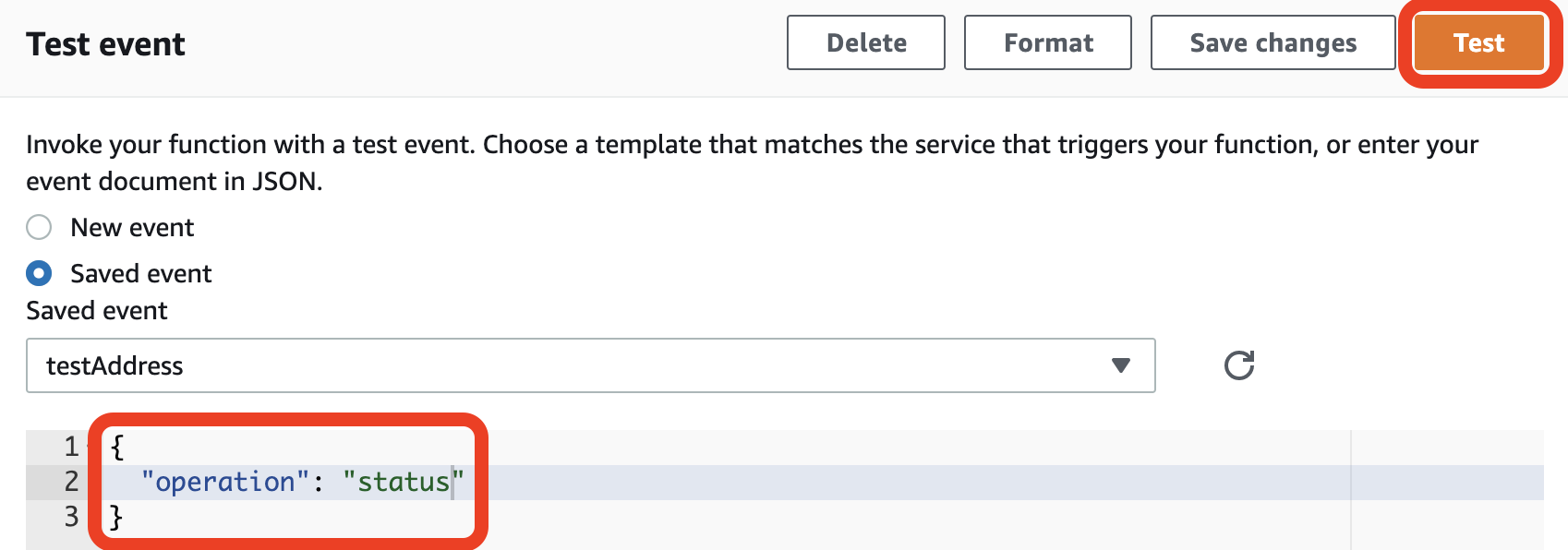 - 次の JSON スニペットを新しいテストイベントのリクエストとして使用します。