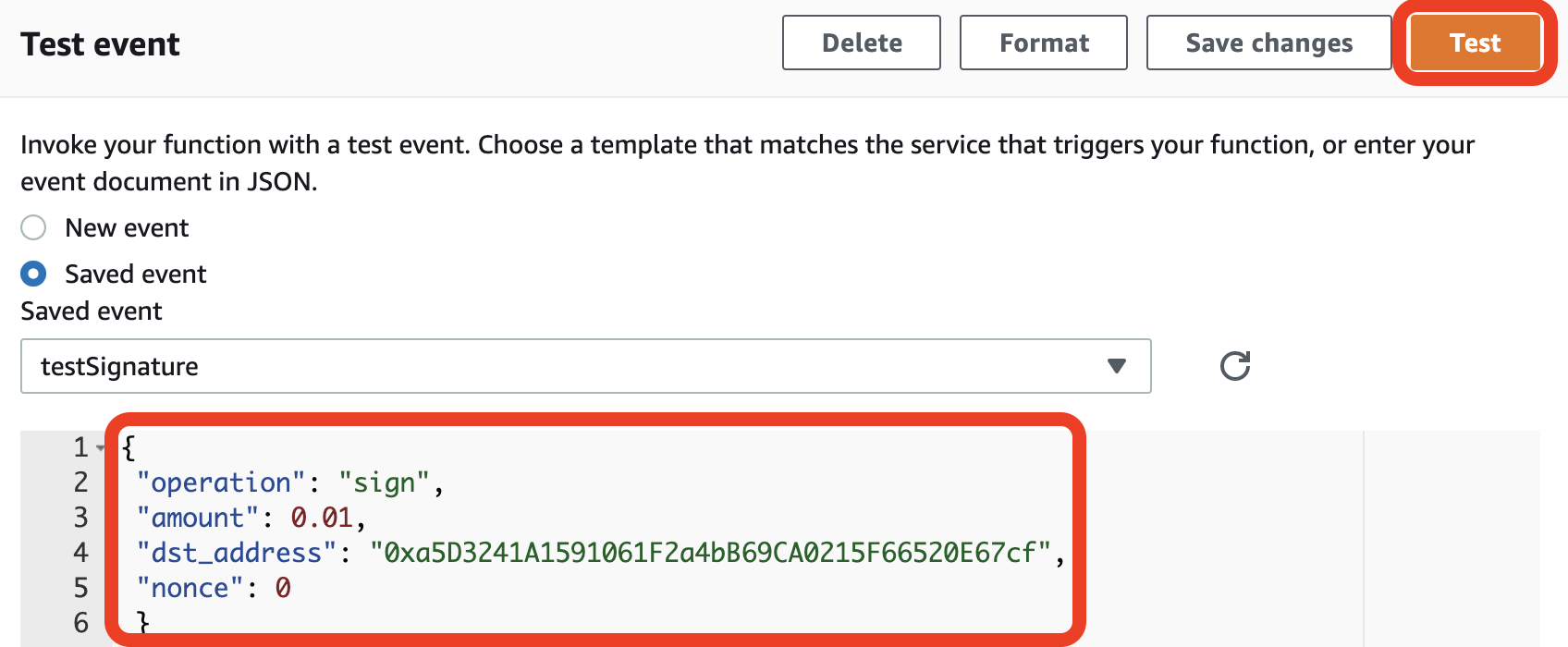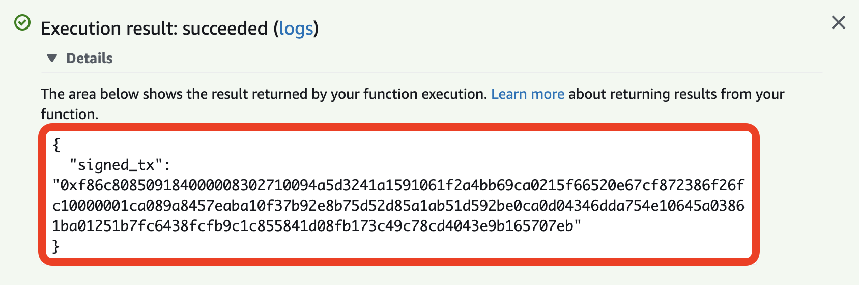 - 指定した CMK ベースのアドレスでEthereumトランザクションを作成して署名するには、次の JSON スニペットを使用して Lambda 関数を実行します。