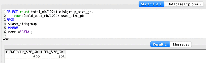 次のスクリーンショットから、DATA ASM ディスクグループ用にプロビジョニングした 600 GB から 500 GB を少し上回って使用されていることが分かります。