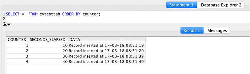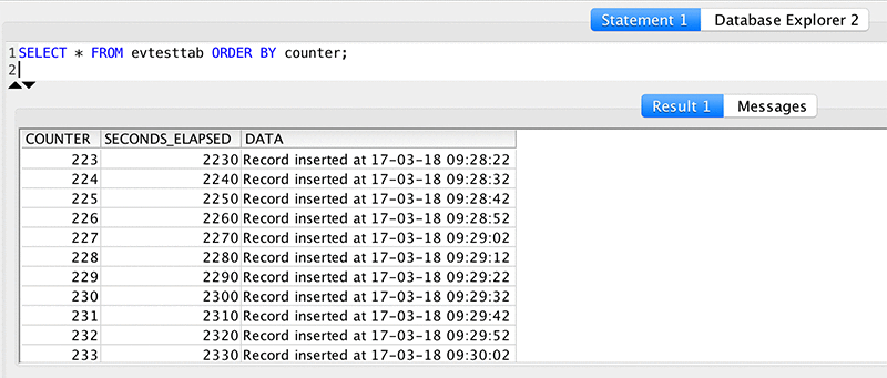 Evtesttab テーブルをクエリして、PL/SQL プロシージャの実行が途切れていないことを確認します。さらに、次のスクリーンショットに示すように、10 秒間隔でギャップを置かずレコードが挿入されていることを確認します。