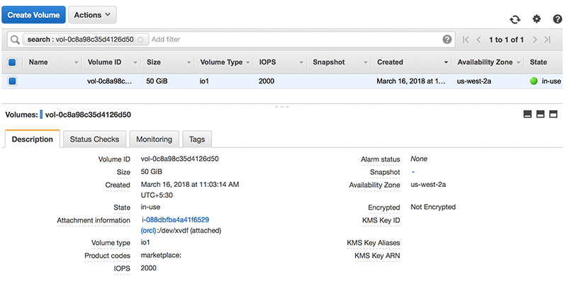 AWS マネジメントコンソールから、EBS ボリュームのサイズを確認します。現在、6 つの EBS ボリュームの 1 つは、次のスクリーンショットが示すように、50 GiB です。