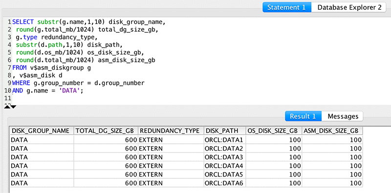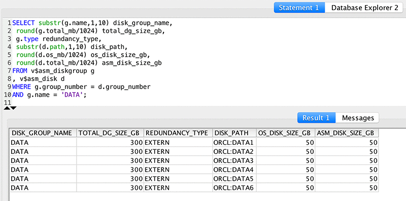 次に、v $ asm_diskgroup ビューをクエリします。DATA ディスクグループの合計サイズは 300 GB で、次のスクリーンショットに示すように、それぞれ 50 GB の 6 つの ASM ディスク (6 つの EBS ボリュームでバックアップされている) を含んでいます。