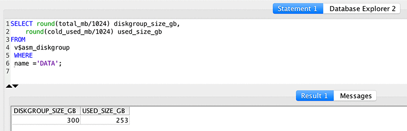 次のスクリーンショットから、DATA と呼ばれる ASM ディスクグループ用にプロビジョニングした 300 GB から、250 GB を少し上回って使用されていることが分かります。