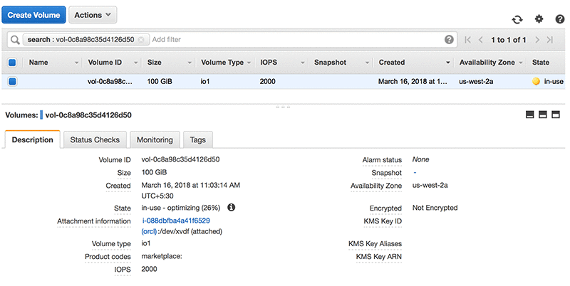 6 つの EBS ボリュームごとに、これを行います。しばらくしてから、AWS CLI を使用して、ボリューム変更要求のステータスを確認します。これで、ボリュームが最適化状態に入ったことがわかり、次のスクリーンショットに示すように、新しいサイズが AWS マネジメントコンソールに反映されます。