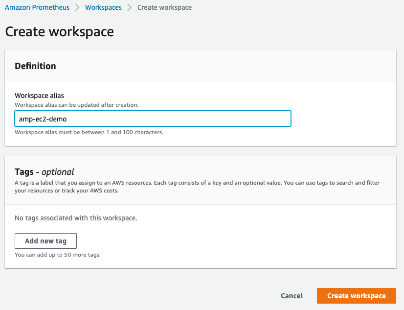 ワークスペースを作成するには、AWS コンソールで AMP にアクセスし、ワークスペースの名前を入力します。