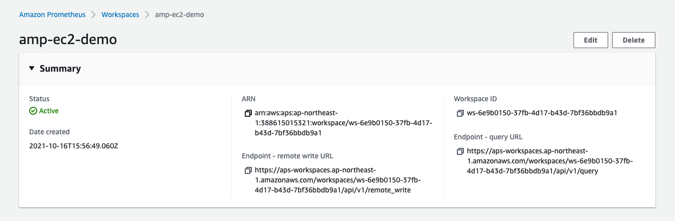作成後、AMP によってremote write 用の URL とクエリ用の URL が提供されます。