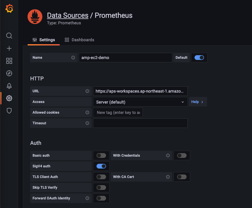 IAM の権限で AMP へのクエリに署名するため、Grafana を実行する前に AWS Sigv4 認証を有効にします。
