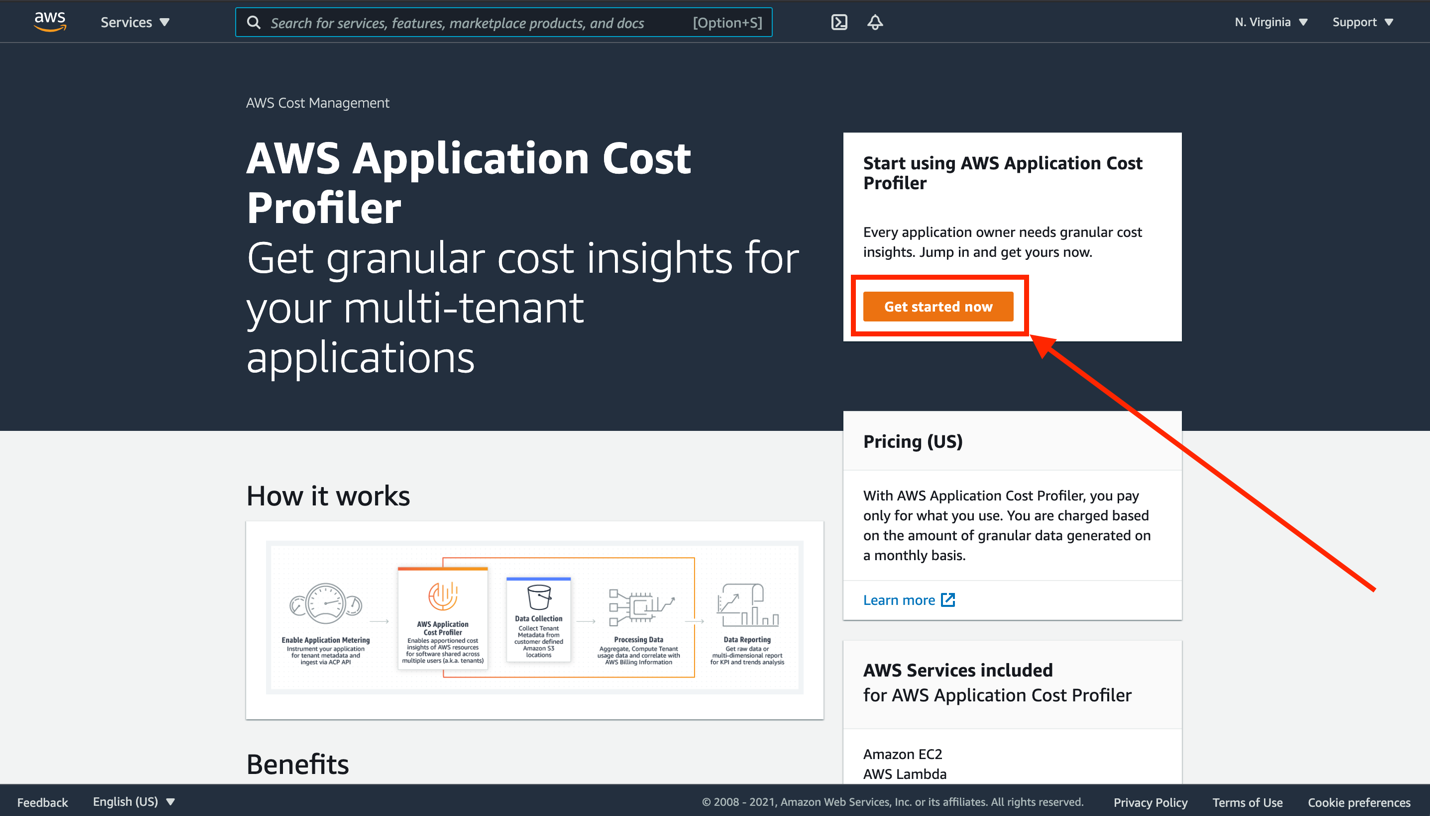 - AWS Application Cost Profiler のダッシュボードで、[Get started now] をクリックします。