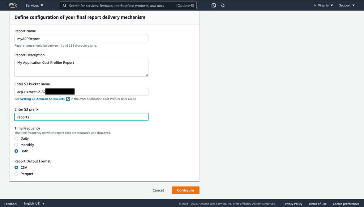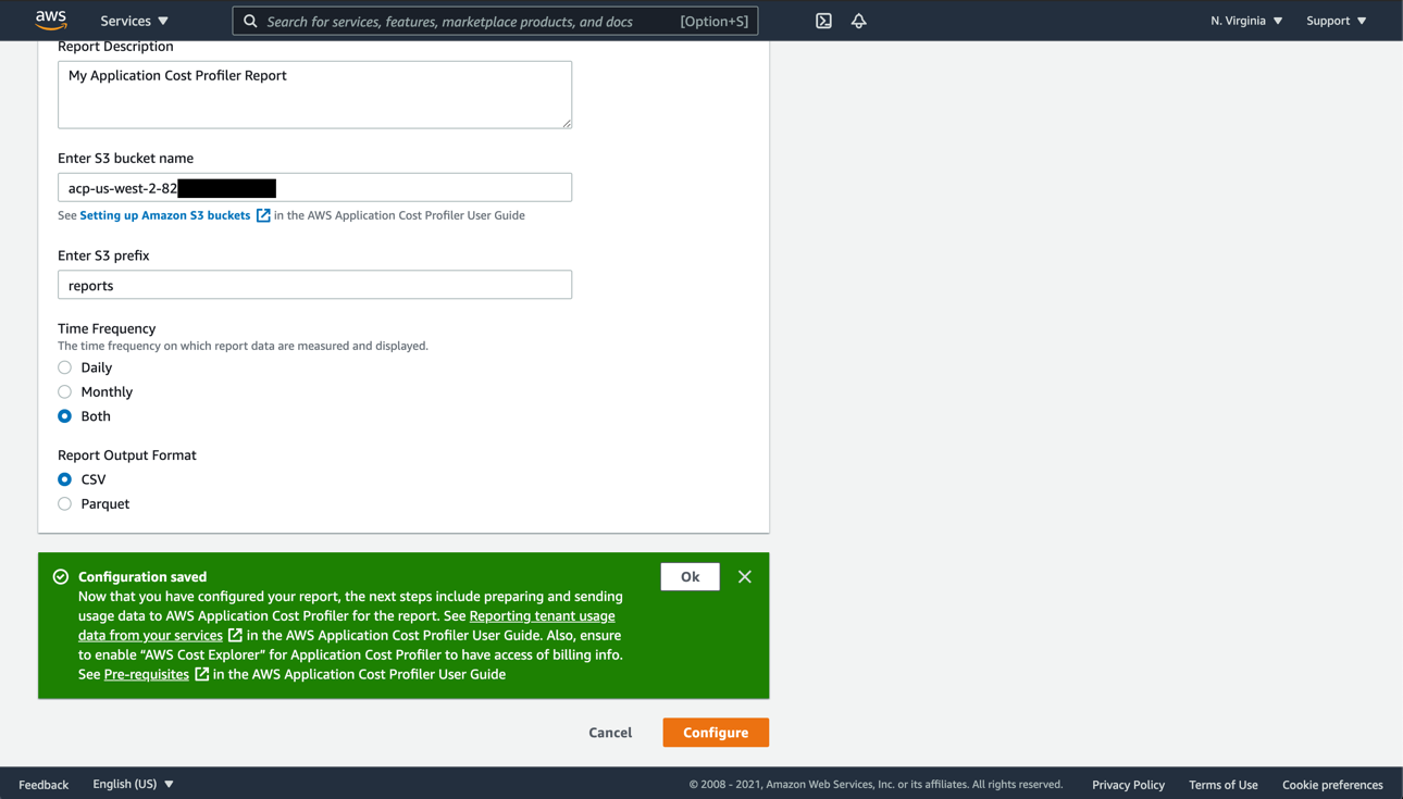 - [Configure] ボタンをクリックします。Application Cost Profiler は、上記で定義されたバケットの存在と、上記で定義されたプレフィックスに対するサービスの書き込み権限を確認します。成功すると、確認メッセージが表示されます。