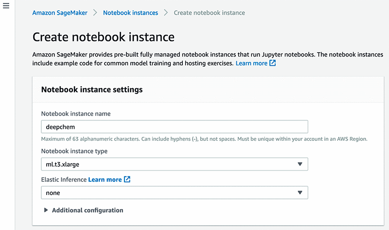 deepchemという名前を使用します。 - Notebook instance type には、希望するインスタンスタイプを入力します。この記事では