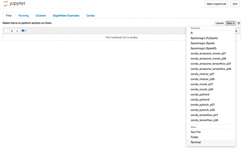 上記の手順を完了してノートブックインスタンスを作成すると、Amazon SageMaker は ML コンピューティングインスタンスを起動します。Notebook インスタンスには、事前設定された Jupyter Notebook サーバーと Anaconda ライブラリのセットがあります。