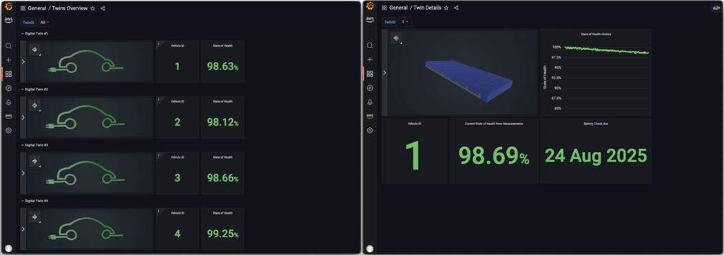 予測結果は AWS IoT TwinMaker にフィードされた後に、Amazon Managed Service for Grafana を介してフリートオペレーターが簡単に使用できるダッシュボードで健康状態や他の車両情報を監視できるようになります。