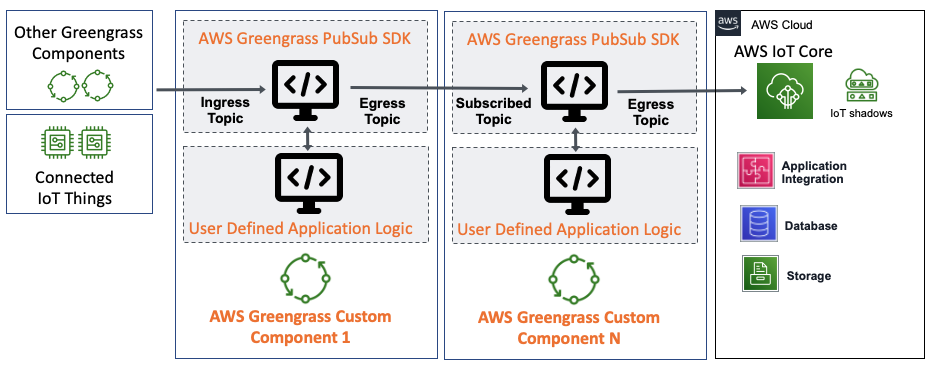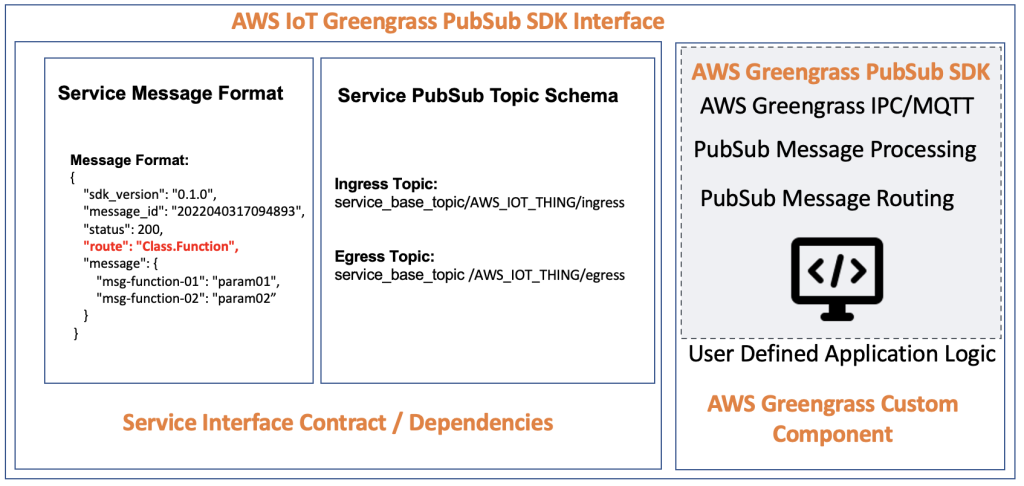 - メッセージングサービスの定形コード: SDK は AWS IoT Greengrass IPC および MQTT PubSub 機能を抽象化し、PubSub メッセージを処理してユーザー定義のアプリケーションコールバックにルーティングします。