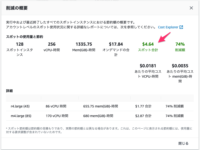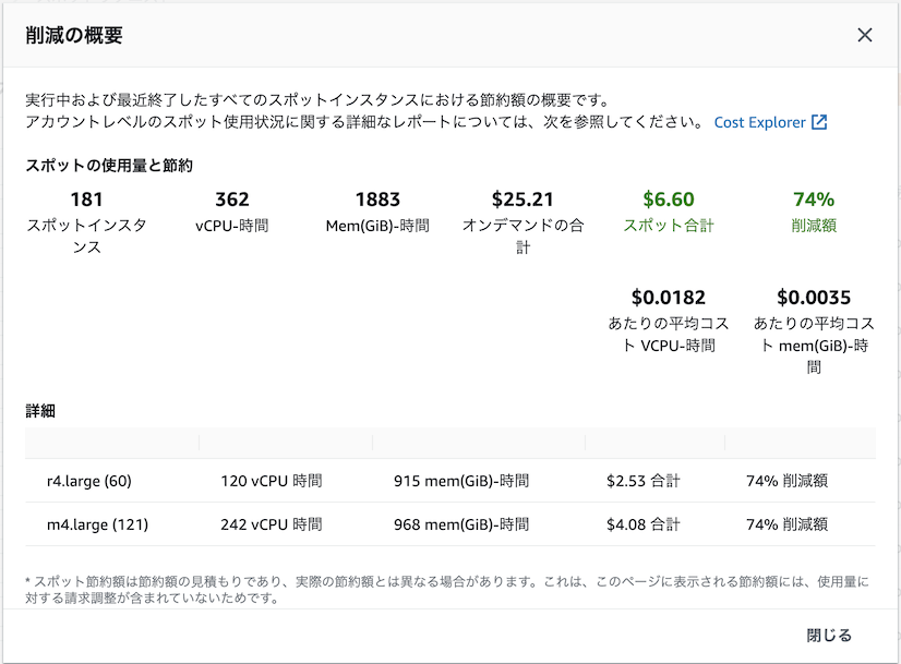Amazon EC2 コンソールの [スポットリクエスト] セクションにある [削減の概要] を確認してみると $6.60、オンデマンドと比較して 74% もインスタンス料金を削減できているようです。