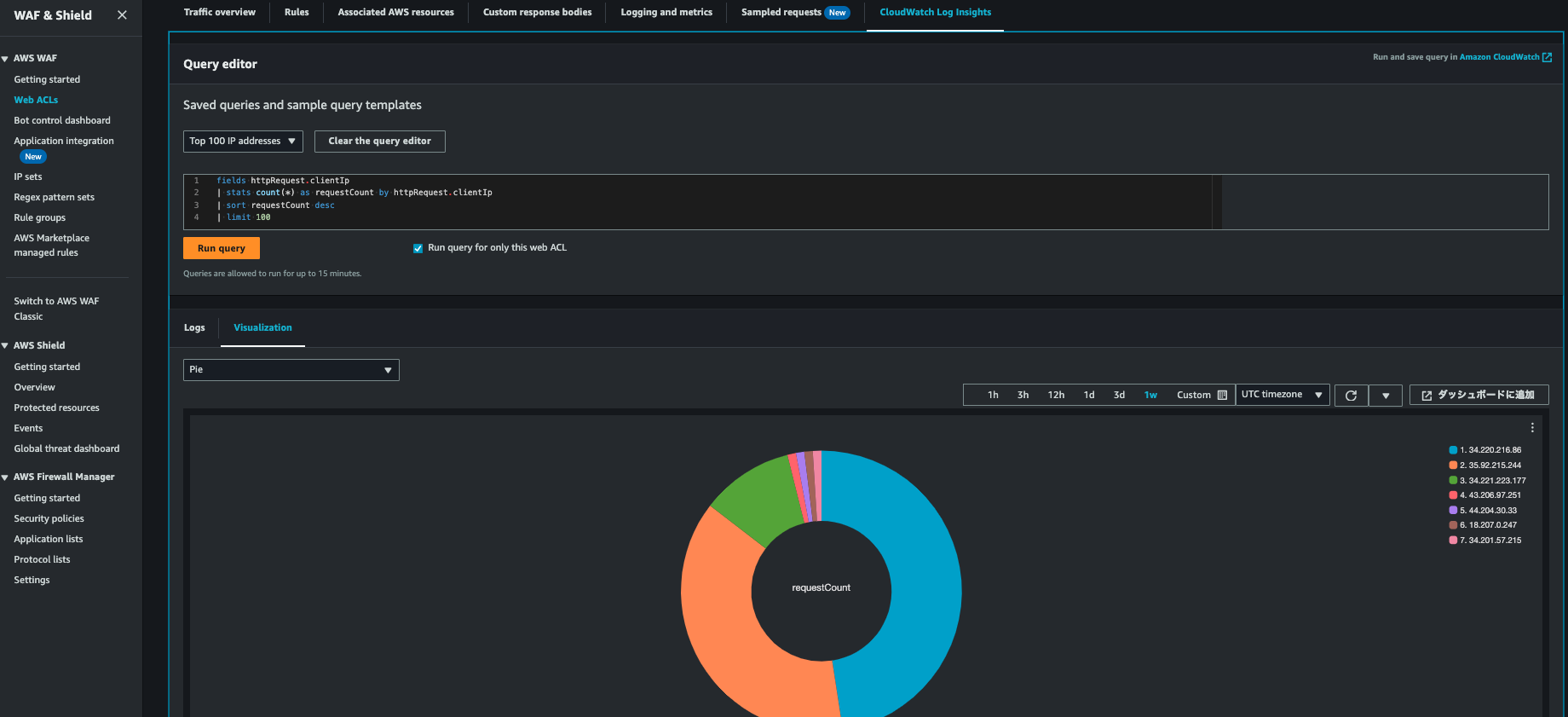 また、CloudWatch Logs Insights は AWS WAF のコンソールからも利用することができます。こちらでは、サンプルクエリとして Top 100 IP addresses や Top 100 user-agents などよく使われるものもいくつか用意されており、試しやすいようになっています。可視化のタブに移動すると、データをグラフで表示することができます。