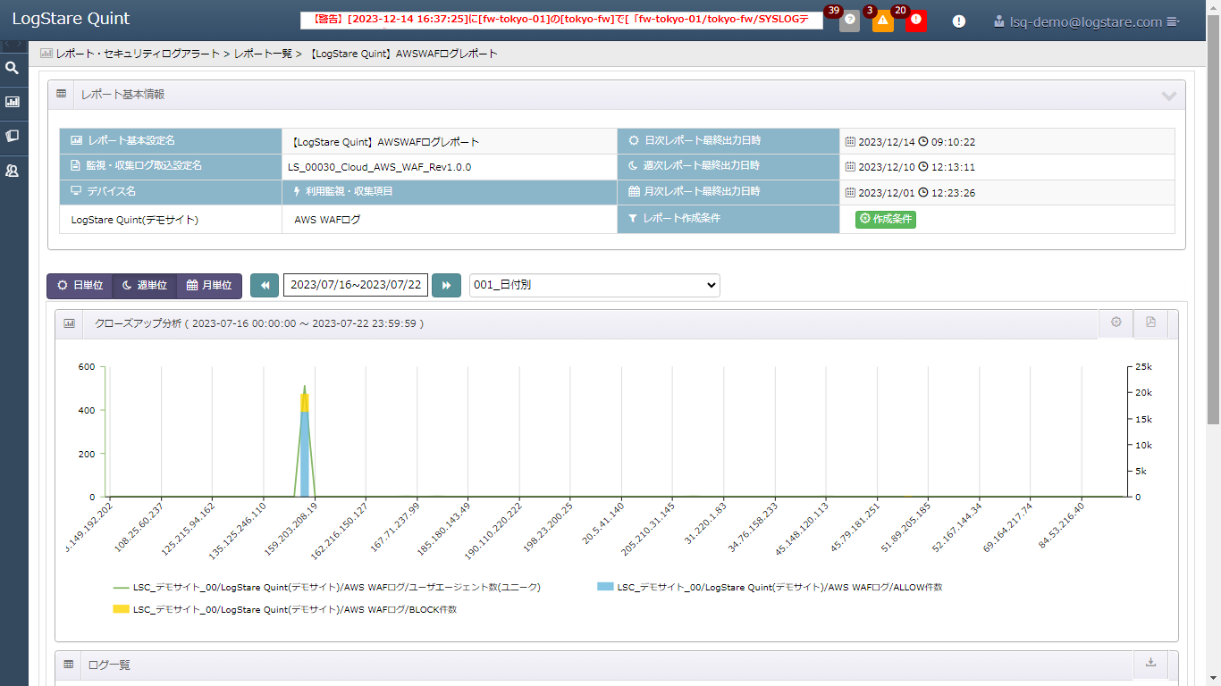 また、前述のドリルダウン分析をせずとも、日次レポートから同様の分析をすることも可能です。この場合はレポート単位を「日単位」にし確認したい日付 (この例では 2023/7/20) を設定、レポートの一覧から「003_送信元 IP アドレス別」を選択します。