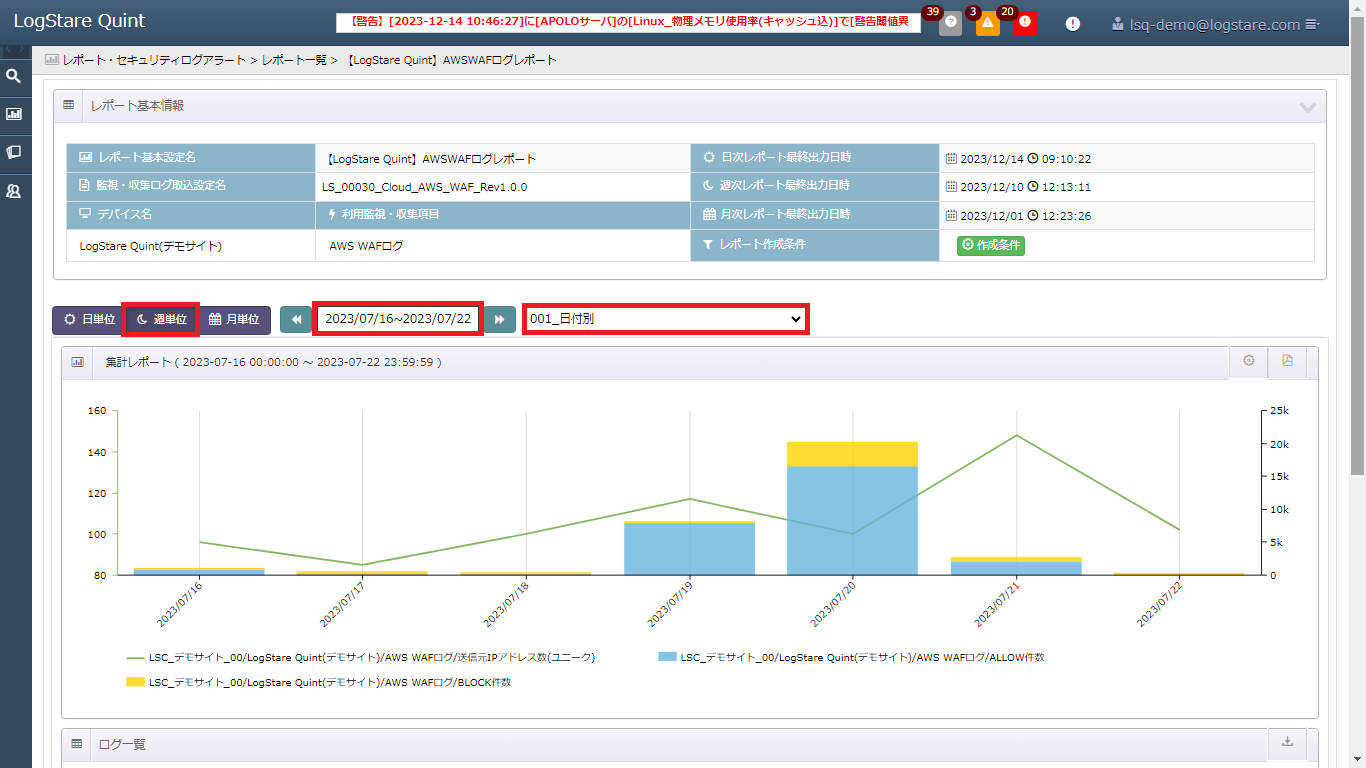 一週間の通信のサマリレポートは LogStare の標準のレポートとして提供されているので、LogStare のレポート画面でレポート単位を「週単位」にし確認したい日付範囲 (この例では 2023/7/16 – 2023/7/22 の一週間とします) を設定します。次に、レポートの一覧から「001_日付別」を選択します。表示されたレポートから一週間の全体の通信の傾向を把握できます。