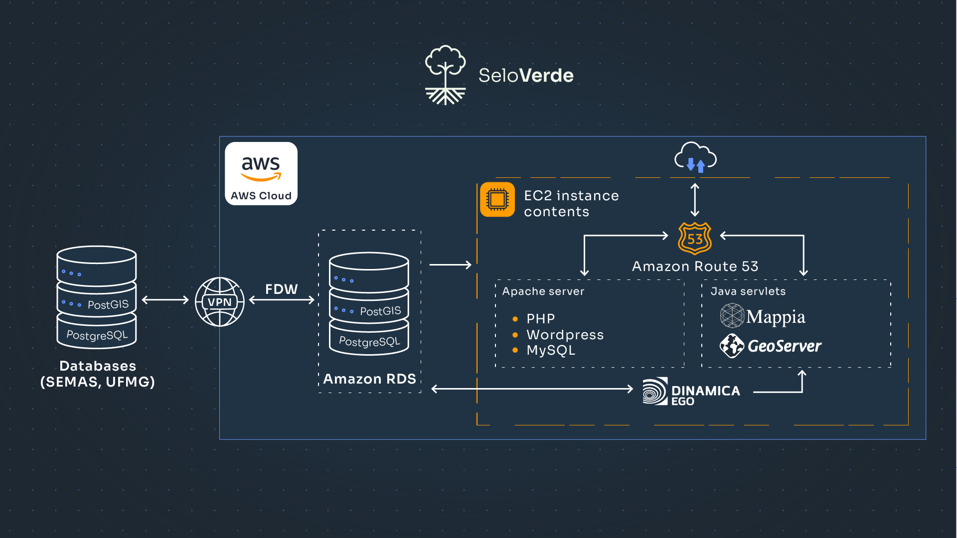 Architectural diagram of the solution described in this blog. The major components are an Amazon Simple Storage Service (Amazon S3) bucket and an Amazon RDS instance, using an Apache server, analyzing publicly available data sources including ASDI, and Amazon Route 53 to generate the content of SeloVerde’s website. (Image credit: Escada Amarela)