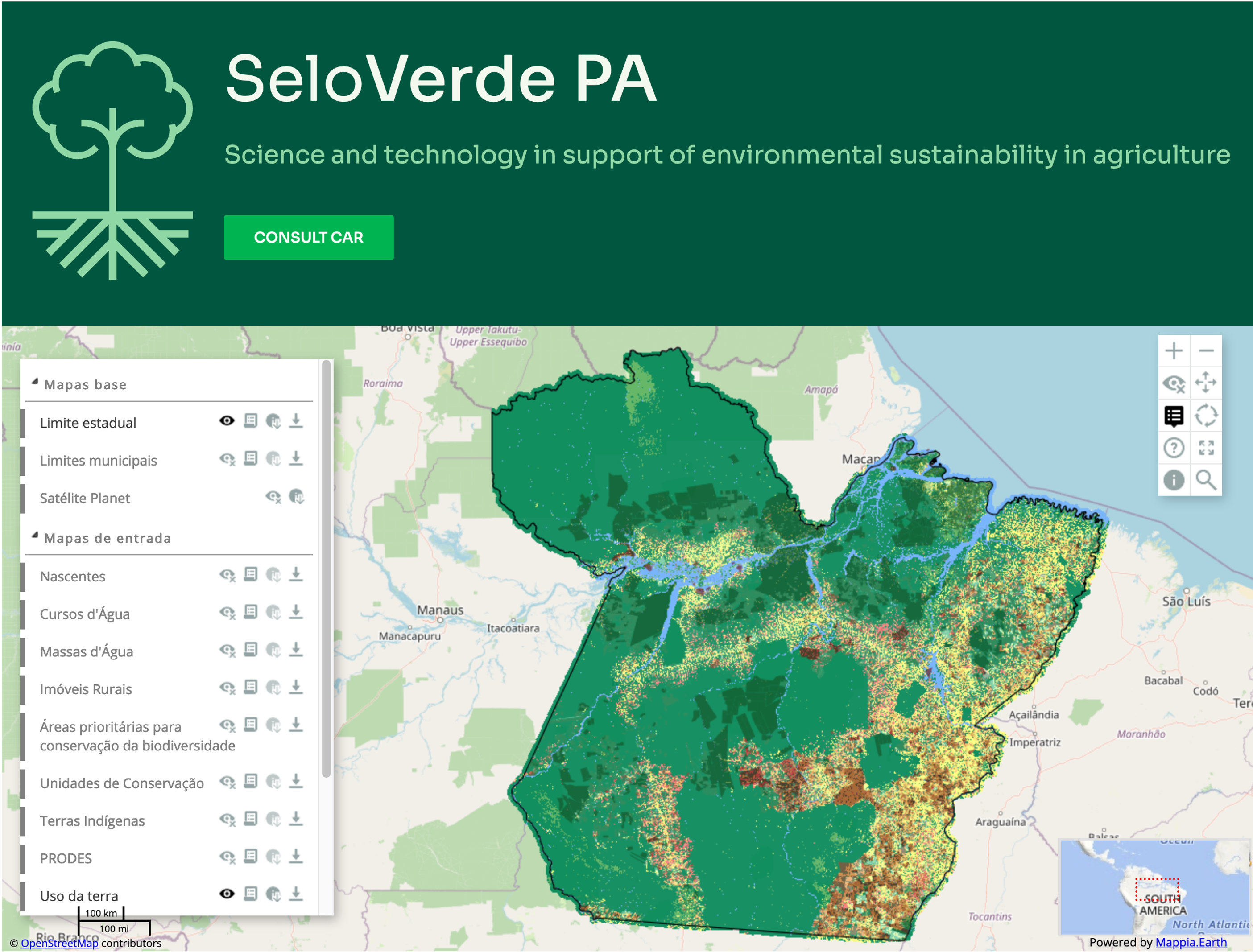 Screenshot of SeloVerde 2.1, which is currently tracking deforestation and land cover change of about 300,000 rural properties and monitoring an estimated 20 million hectares of forest areas in the State of Pará, Brazil.