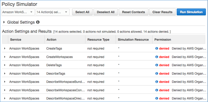 The following screenshot of the IAM policy simulator shows which permissions are set for the administrator after I apply the HIPAA SCP. Also, note that the IAM policy simulator shows that the Deny permission is being denied by Organizations. Because the policy simulator is aware of the SCPs attached to an account, it is a good tool to use when troubleshooting or validating an SCP.