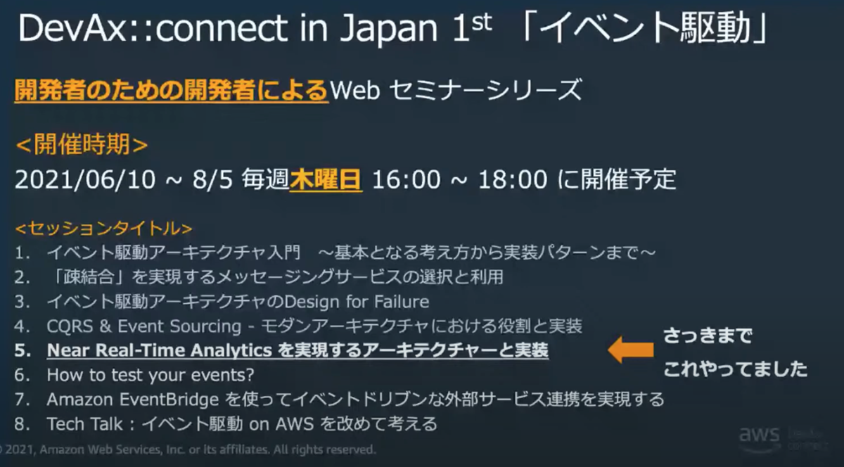 AWS を活用したイベント駆動アーキテクチャでのシステム設計に於いて、メッセージブローカーや状態管理、テスト、冪等性など考えないといけないことが多く、ベストプラクティスもよくわからない世界なので、こういった丁寧なウェビナーがあると世の中の開発者のイベント駆動アーキテクト能力が向上されていい未来が訪れそうだなと思いました。