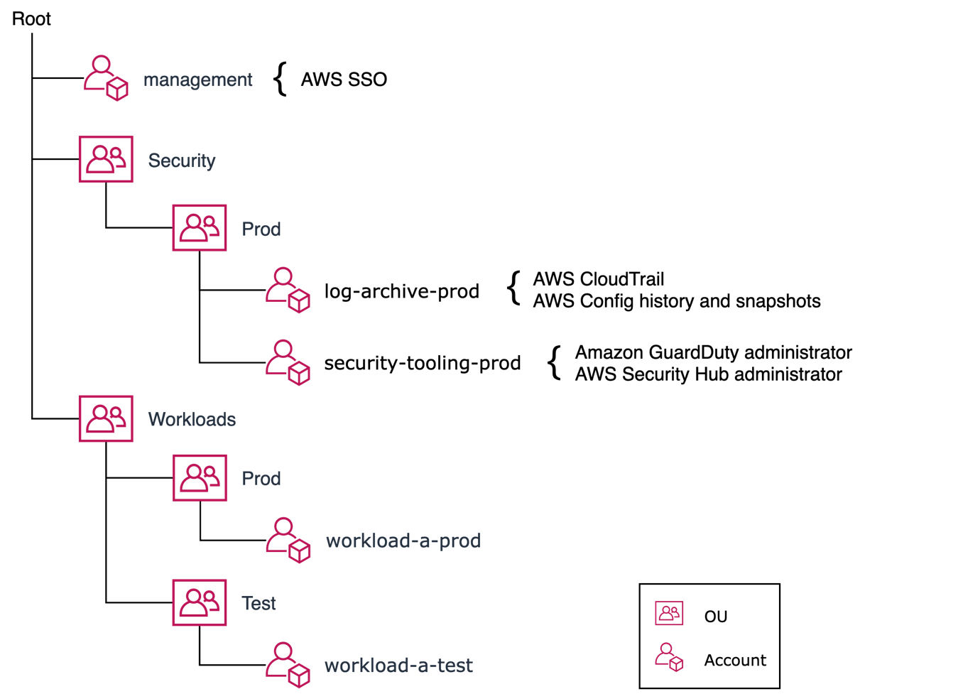 OU 設計については「AWS Organizations における組織単位のベストプラクティス」を参考にして頂ければと思います。一方で、OU は後からも設定を変えることが可能です。変に複雑な構成になるぐらいであれば、運用しながら要件を洗い出し、後ほど OU を再設計するのも一つの手です。まずは「Production starter organization」を参考に下記のようなシンプルな形から初めてはいかがでしょうか。