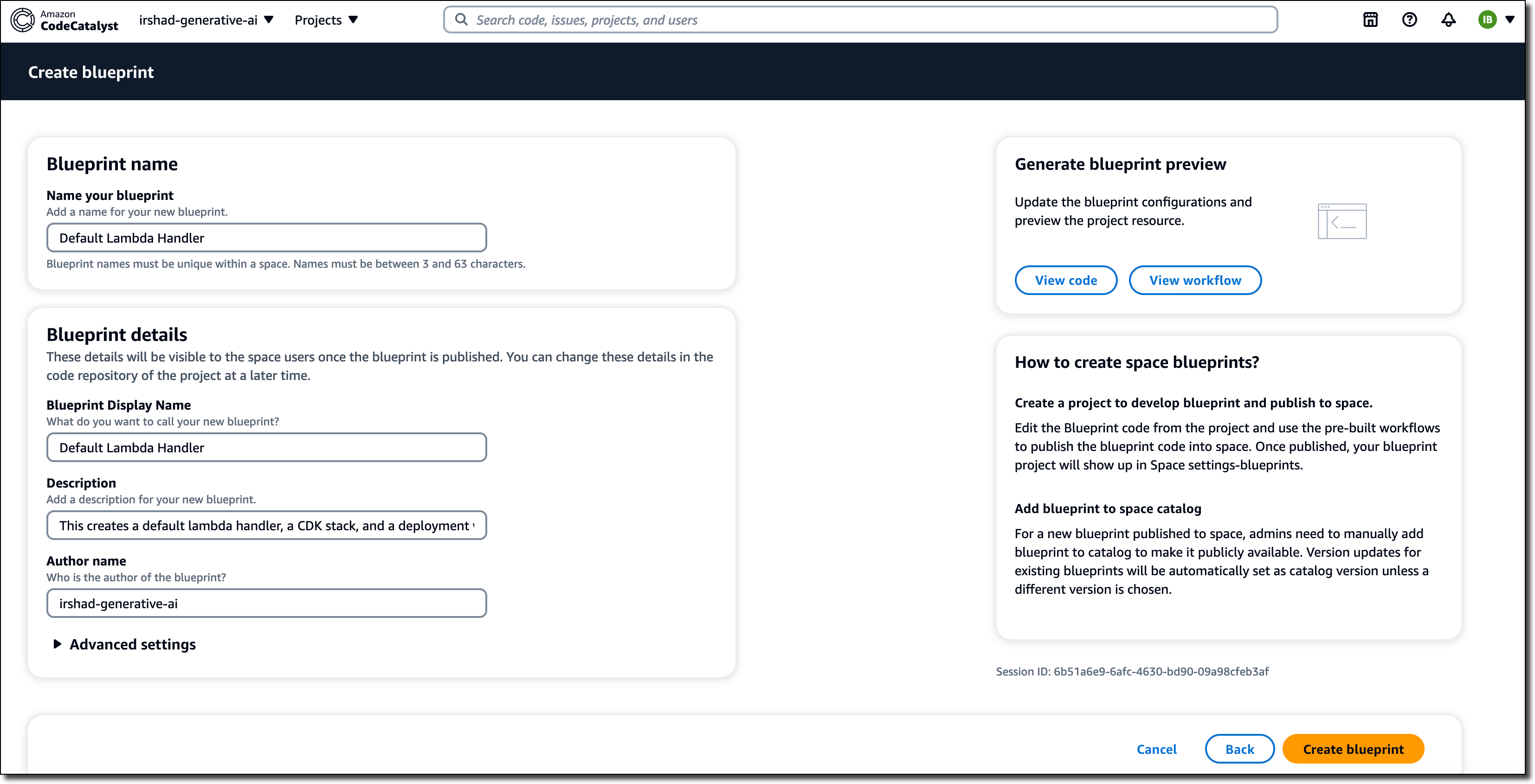 CodeCatalyst 콘솔을 연 다음, 내 스페이스로 이동합니다. 설정 탭의 왼쪽 탐색 창에서 블루프린트을 선택한 다음, 블루프린트 생성을 선택합니다. 이 시점에서 모범 사례를 이 청사진에 체계화합니다. 준비가 되면 내 스페이스에 다시 게시하여 팀에서 프로젝트를 생성하는 데 사용할 수 있도록 하겠습니다.