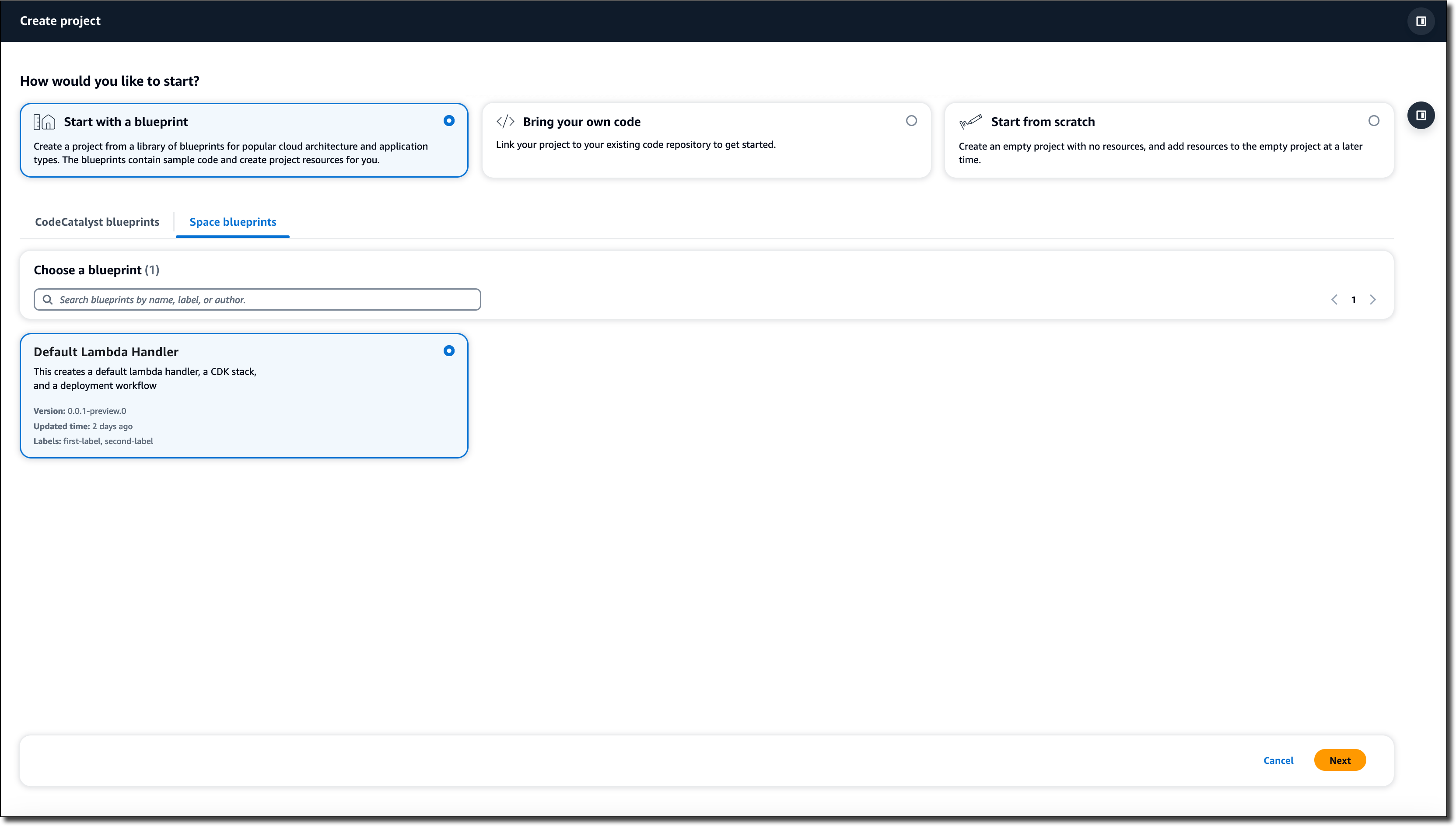 프로젝트 생성 > 스페이스 블루프린트를 차례로 선택하여 맞춤형 블루프린트를 사용하여 CodeCatalyst 프로젝트를 생성합니다.