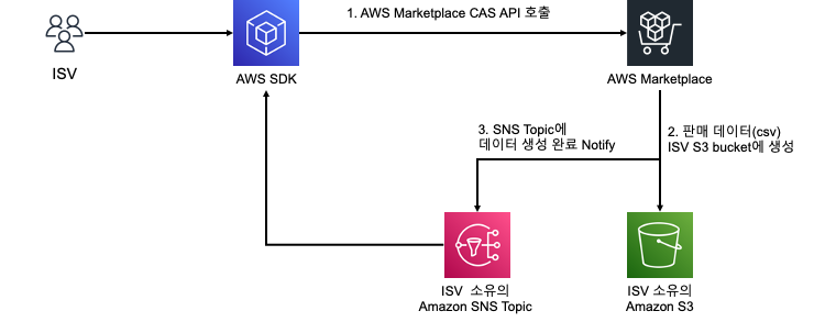 판매 데이터 분석은 성공적인 마켓플레이스 비즈니스를 위해 필수적 입니다. 이를 위해 AWS Marketplace 는 ISV 에게 판매 데이터를 두 가지 형태로 제공 합니다. 첫 번째는, AWS Marketplace Management Portal 내 Report 화면을 통해 비즈니스 레포트 를 제공 합니다. 두 번째는 AWS Marketplace Commerce Anaytics Service(CAS)에서 API 를 통해 판매 관련 데이터를 제공 합니다. 즉 ISV가 AWS SDK 또는 CLI을 통해 CAS API을 호출(판매 데이터 요청) 하면 CAS가 요청 받은 판매 데이터를 ISV 소유의 S3 버킷에 배포 합니다. 이어서 배포가 완료 되면 이를 Amazon SNS 를 통해 알림을 보내 옵니다. 따라서 ISV 는 이를 활용 하여 판매 데이터 수집 을 자동화 하고, 더 나아가 다양한 AWS 분석 서비스와 연계 하여 판매 데이터 분석을 수행할 수 있습니다.