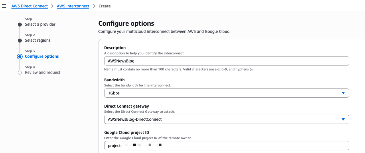 3단계에서 설명을 입력하고 대역폭, 연결할 Direct Connect 게이트웨이, Google Cloud 프로젝트의 ID를 선택합니다.