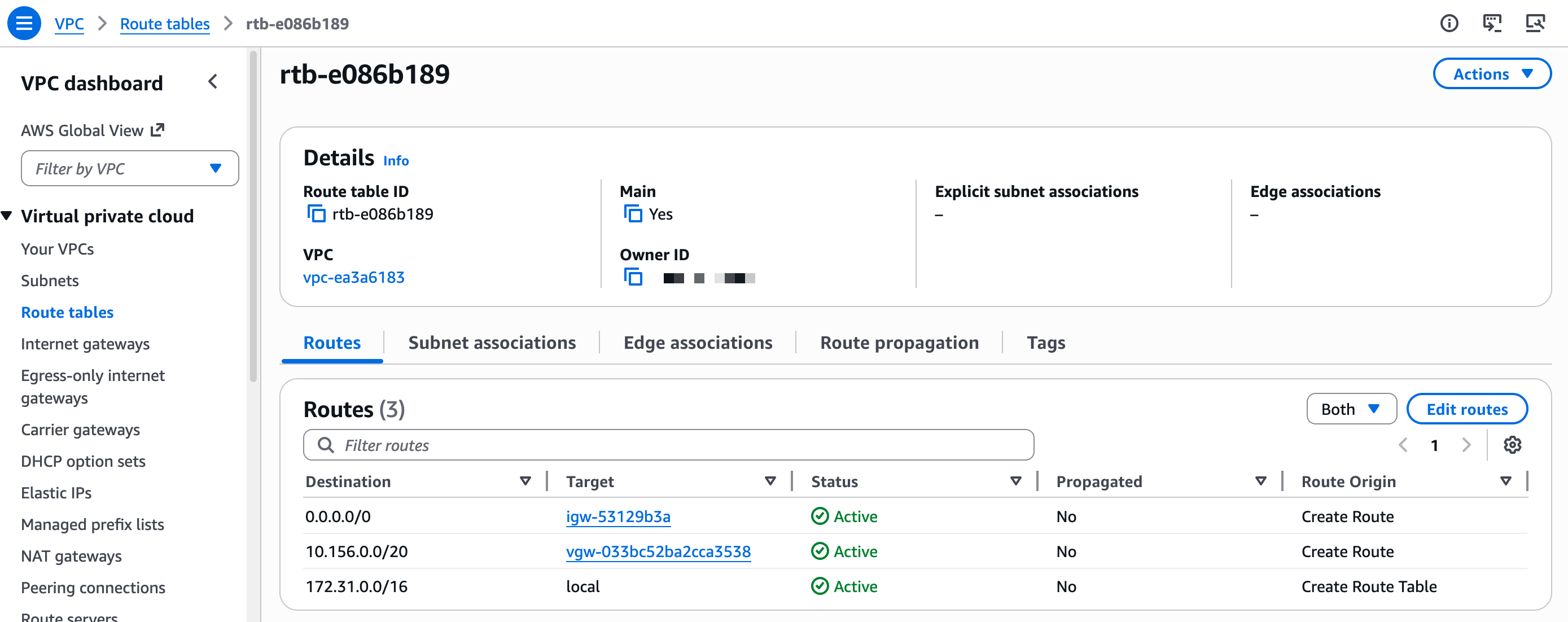 GCP 측에서 네트워크 라우팅을 구성하지 않아도 됩니다. AWS에 마지막 단계를 수행합니다. VPC 라우팅 테이블에 경로 항목을 추가하여 가상 게이트웨이를 통해 모든 트래픽을 GCP IP 주소 범위로 전송합니다.