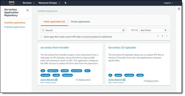 서버리스 앱 리포지토리를 위한 Verified Author 배지 – 서버리스 애플리케이션 리포지토리의 애플리케이션 작성자는 이제 애플리케이션 카드와 세부 정보 페이지의 작성자 이름 옆에 표시되는 Verified Author 배지를 신청할 수 있습니다.
