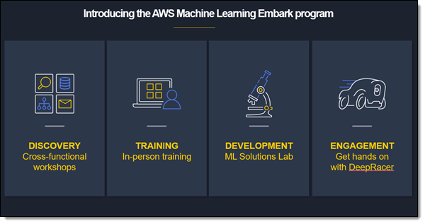Machine Learning Embark – 이 새로운 프로그램은 사내 개발 팀을 기계 학습 전문가로 변환해 주도록 설계되었습니다. 이 프로그램은 AWS 자체의 내부 경험을 기반으로 구성되었으며 기계 학습 여정에 발생하는 일반적인 도전 과제를 해결 및 극복하는 데 도움이 될 것입니다. 자세한 내용은 블로그 게시물을 참조하십시오.