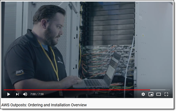 AWS Outposts: Ordering and Installation Overview – 이 동영상은 Outposts 랙을 주문 및 설치하는 과정을 안내합니다. 물리적, 전기적 및 네트워크 요구 사항에 대해 알아보고 실제 설치 과정을 볼 수 있습니다.