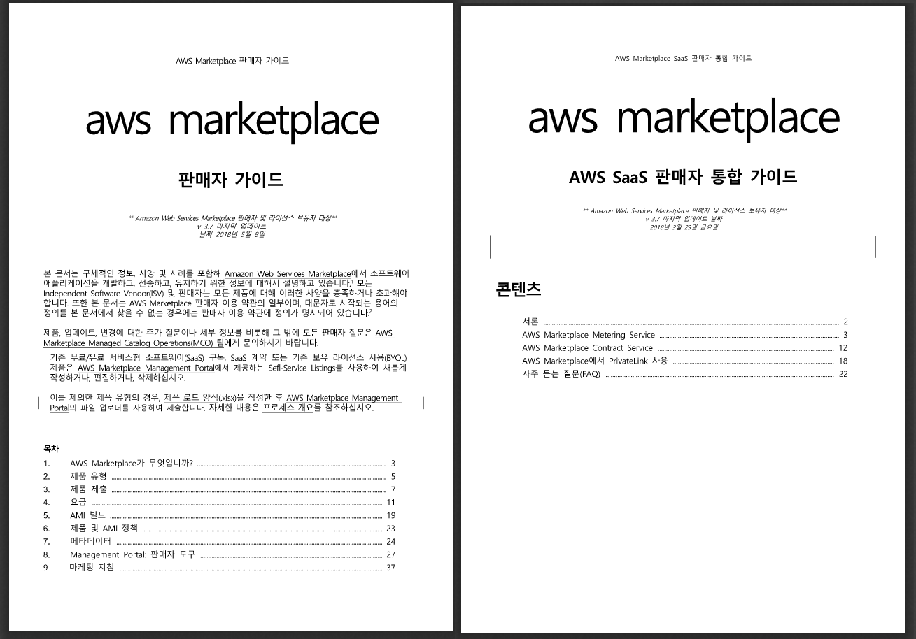 AWS 마켓플레이스의 상품 등록을 위한 필수 문서인 ‘AWS 마켓플레이스 판매자 가이드’와 대부분의 솔루션 회사들이 고려하는 SaaS 상품의 빌링 통합을 가이드하는 ‘SaaS 판매자 통합 가이드’의 아래 한국어 버젼 발행을 통해 국내 기술 파트너사의 활발한 AWS 마켓플레이스 참여를 기대합니다.