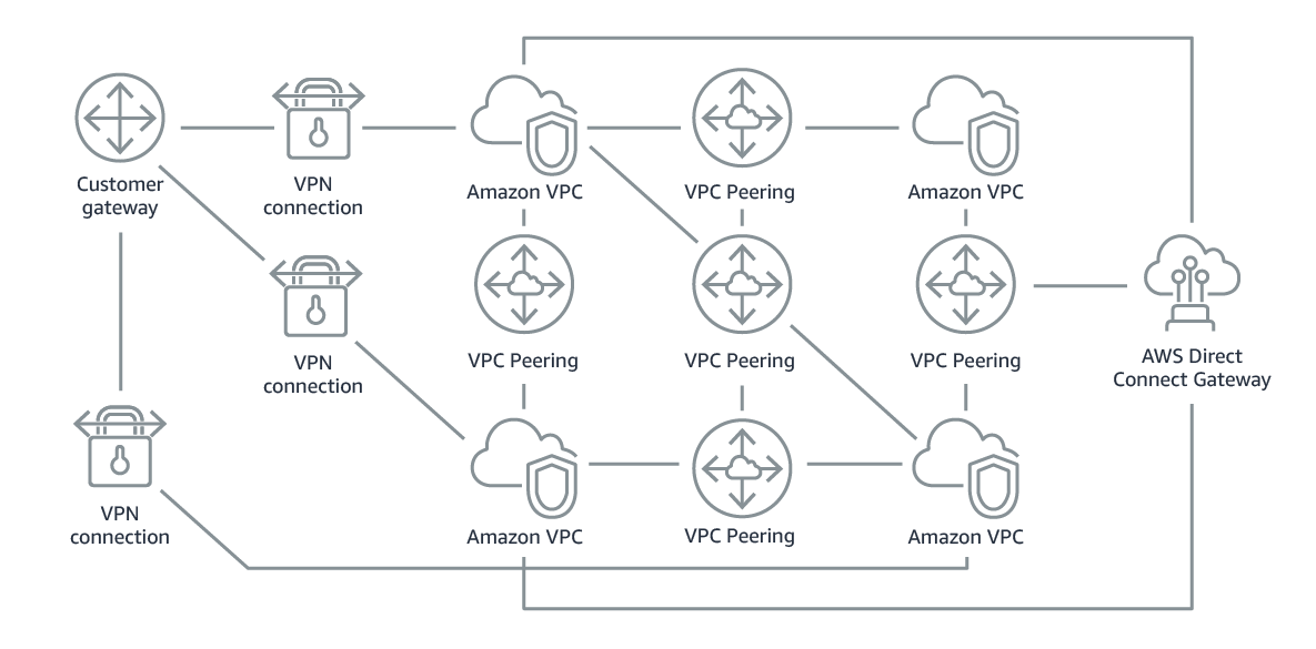 AWS Transit Gateway는 고객이 단일 게이트웨이를 사용하여 수천 개의 VPC (Virtual Private Cloud) 및 온-프레미스 네트워크를 연결할 수 있는 서비스입니다. 여러 AWS 계정에서 여러 VPC를 만들게 되어 이를 연결하려면 VPC Peering이라는 기술을 사용하게 되는데 각 네트워크를 연결하는 방식이 복잡하고 숫자가 많아지면 운영에 드는 비용이 커집니다.