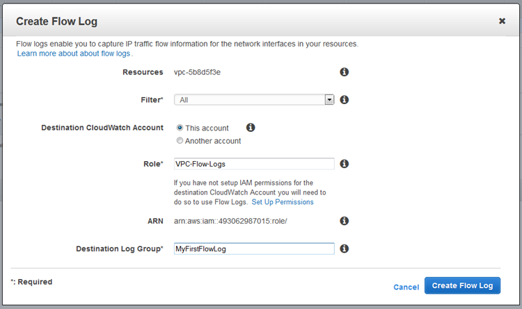 AWS 관리 콘솔, AWS 명령 줄 인터페이스 (CLI) 및 EC2 API 호출을 통해 VPCFlow Logs를 활성화 할 수 있습니다. 아래는 VPC에서 Fow Logs를 사용하는 화면 스크린 샷입니다.