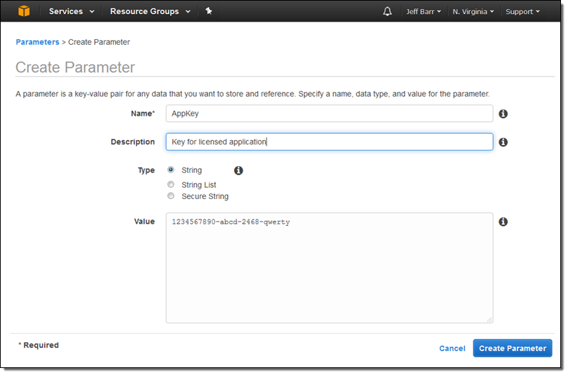 이 기능은 라이센스 키, 비밀번호 및 인스턴스에 배포하려는 기타 데이터의 저장 및 관리를 단순화합니다. 각 매개변수는 형(문자열, 문자열 리스트, 보안 문자열)이 지정되어 있고 암호화된 형태로 저장할 수 있습니다. 다음은 매개변수를 생성하는 방법입니다: