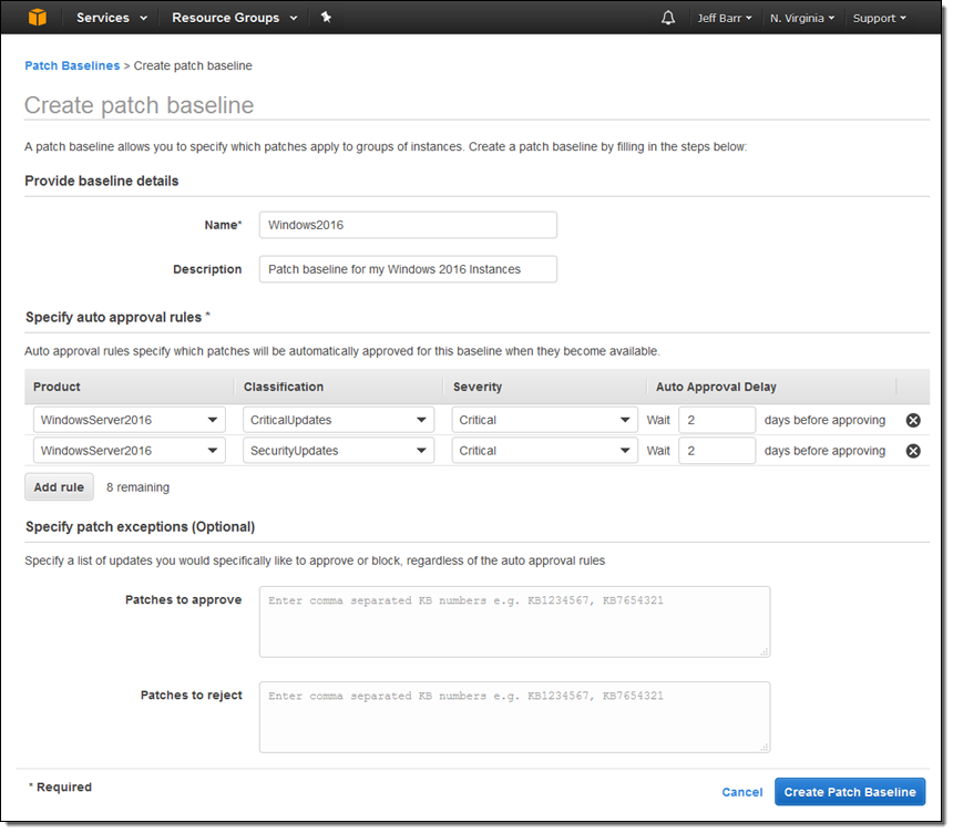 이 기능은 Windows 인스턴스에 있는 운영체제를 최신으로 유지하게 도와줍니다. 지정한 유지관리 기간 동안 패치를 적용하고 기준을 준수하여 수행됩니다. 기준은 분류와 심각도에 따라 패치를 자동으로 승인하는 규칙과 승인 또는 거부할 명시적인 패치 목록을 지정합니다.