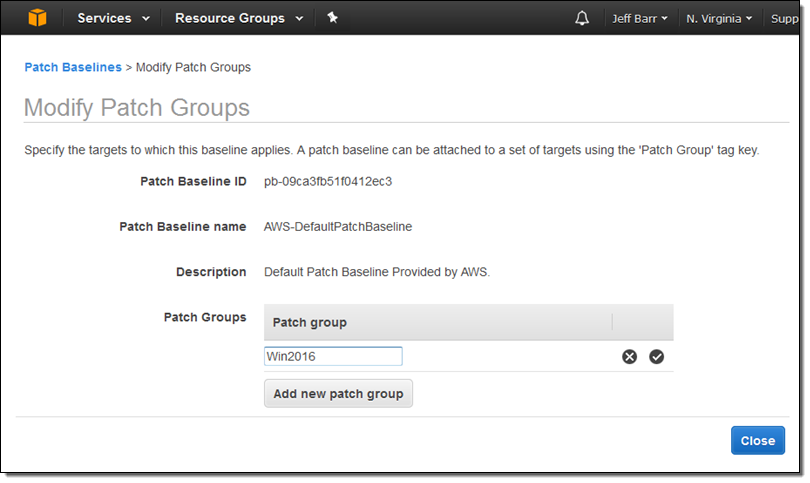 각 기준은 하나 또는 다수의 패치 그룹에 적용될 수 있습니다. 패치그룹에 들어있는 인스턴스는 Patch Group 태그가 있습니다. 저는 그룹에 Win2016라는 이름을 붙였습니다: