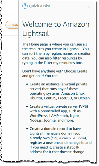 우선 AWS 관리 콘솔을 통해 Lightsail을 들어가면 Quick Assist 탭이 각 페이지 마다 보입니다. 여기를 클릭해서 필요한 문서와 도움을 얻을 수 있습니다.