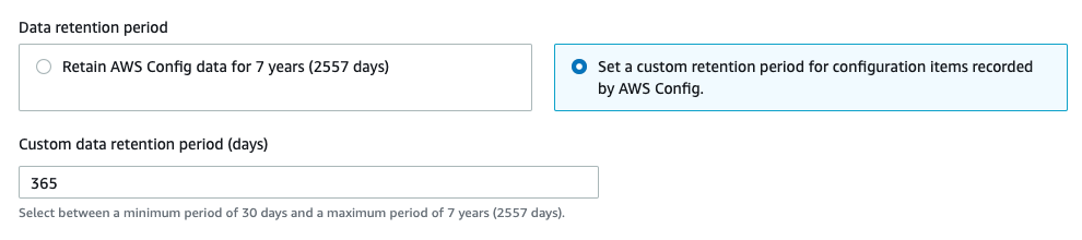 - 편집을 클릭하고 [그림 3]에 표시된 대로 데이터 보존 기간 섹션에서 “AWS Config에서 기록한 구성 항목에 대한 사용자 지정 보존 기간 설정”을 선택하고 규정 준수 요구 사항에 따라 사용자 지정 데이터 보존 기간(일)을 변경합니다.